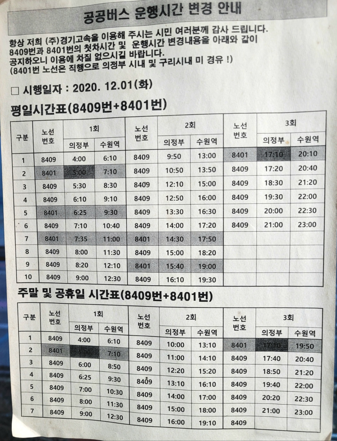 일반은 8401번 어둡게 칠해진 시간은 8401번 시간표입니다. 의정부는 낙양동 공영차고지 출발시간을 나타냅니다.