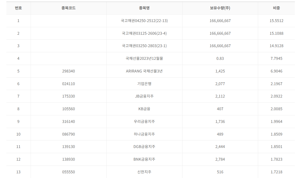 국고채권이 약 45% 채권 선물이 약 14.5% 이후 기업은행 JB금융지주, KB금융등 은행권이 차지합니다. 은행은 배당을 많이 하기로 유명합니다.