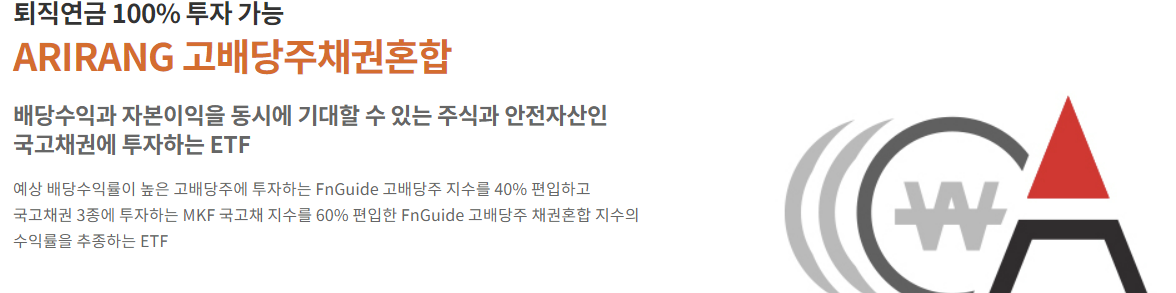 한국의 고배당 ETF 아리랑 ETF는 중에 자산 규모가 가장 크며 고배당 ETF로 워낙 유명한 상품입니다. 또한 아리랑 고배당 ETF 중 아리랑 고배당주채권 혼합형은 퇴직연금 100% 투자 가능합니다.