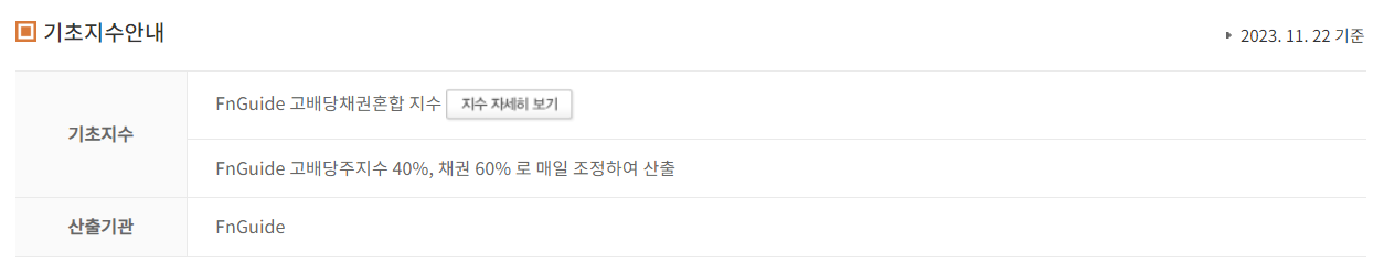 보통 ETF는 s&p 500, 코스닥 100과 같은 지수를 추종하지만 아리랑 고배당주 채권혼합은 FnGuide 고배당채권혼합지수를 추종하며, FnGuide 40%, 채권 60%로 매일 조정하여 산출한다고 합니다. (2023. 11. 22 기준) 표에서 보이듯 채권이 60%이상을 차지하기 때문에 연금저축 투자가 100%로 가능합니다.