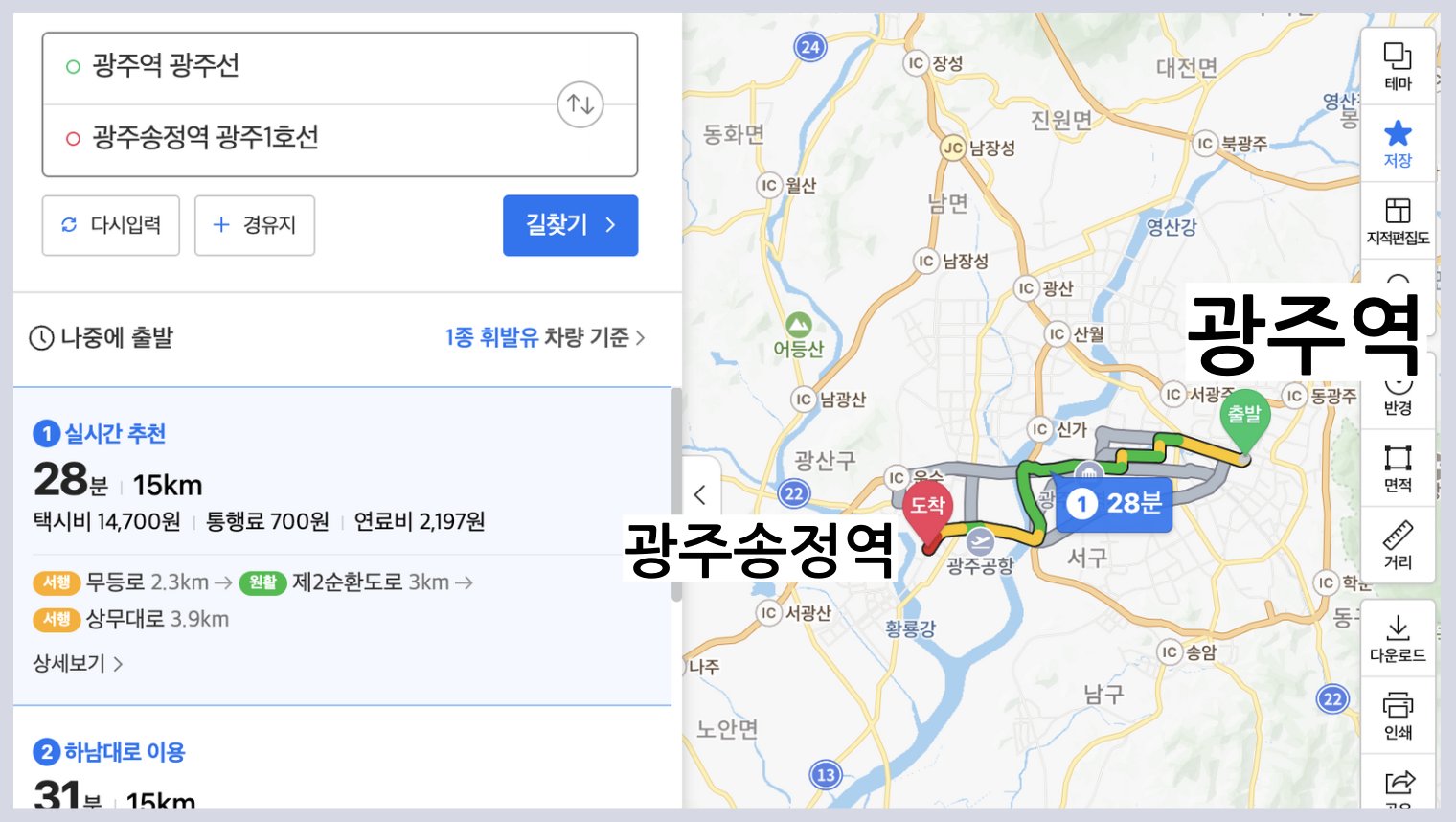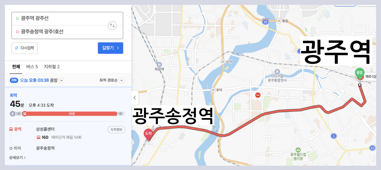 지하철, 버스, 택시를 포함한 광주 도심까지의 이동 경로와 소요 시간은 아래 링크에서 실시간으로 확인할 수 있어요.
