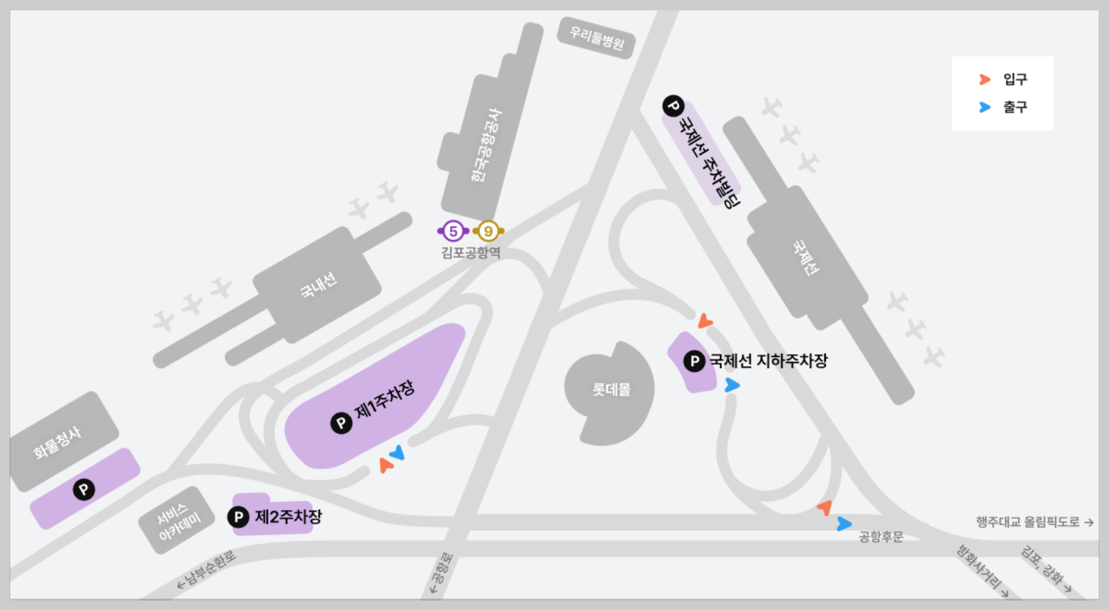 김포공항 주차장 위치도입니다. 각 주차장의 요금이 다르니, 아래 요금 정보를 참고하시면 도움이 됩니다.