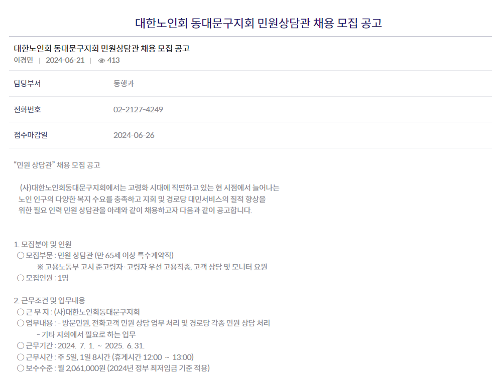 65세 이상의 고령자를 우선 고용합니다. 업무내용으로는 대한 노인회동대문구지회에서 방문민원 및 경로당 각종 민원 상담처리이며 월 206만 원의 보수를 받습니다.