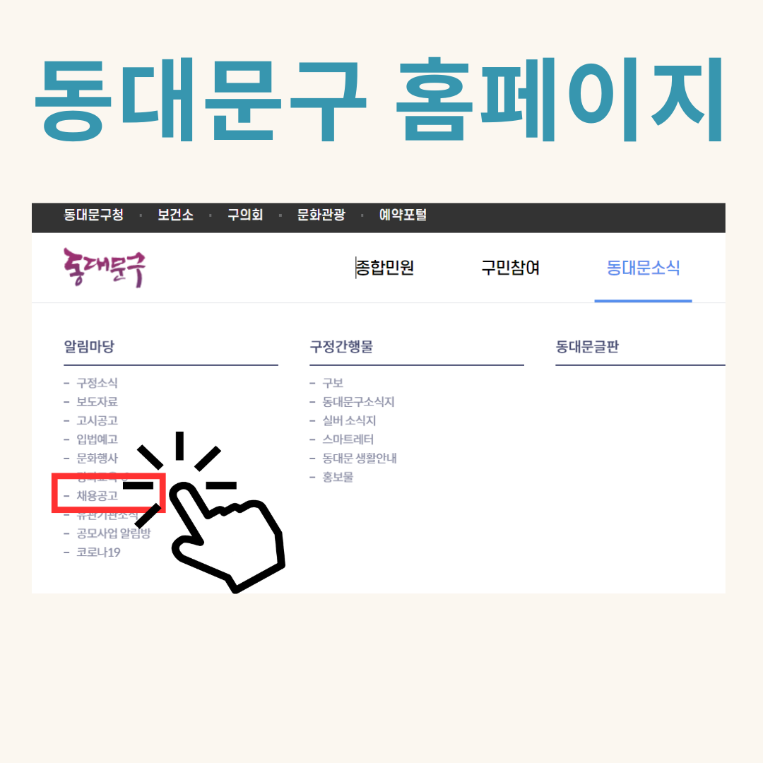 이번글에서는 동대문구를 예시로 살펴보았습니다. 동대문소식 > 알림 마당 > 채용공고를 통해, 일자리를 알아볼 수 있습니다.