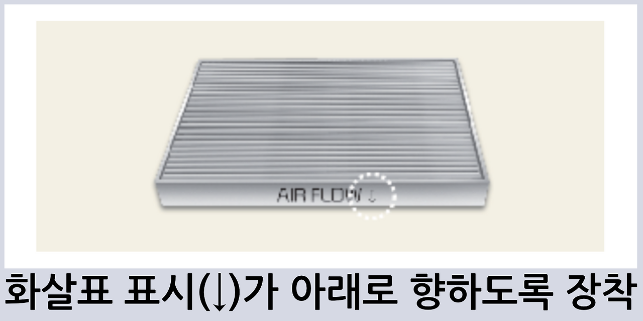 - 필터에는 공기 흐름 방향이 표시되어 있으므로,방향을 정확히 맞추어 장착해야 합니다.