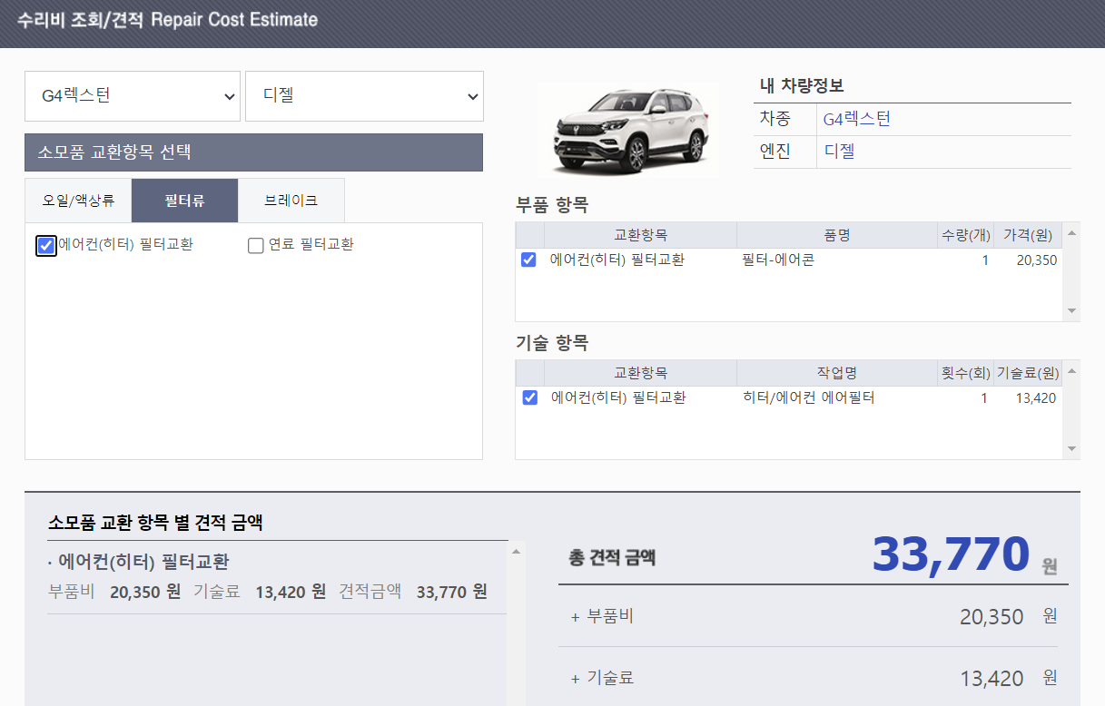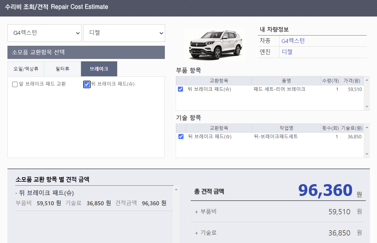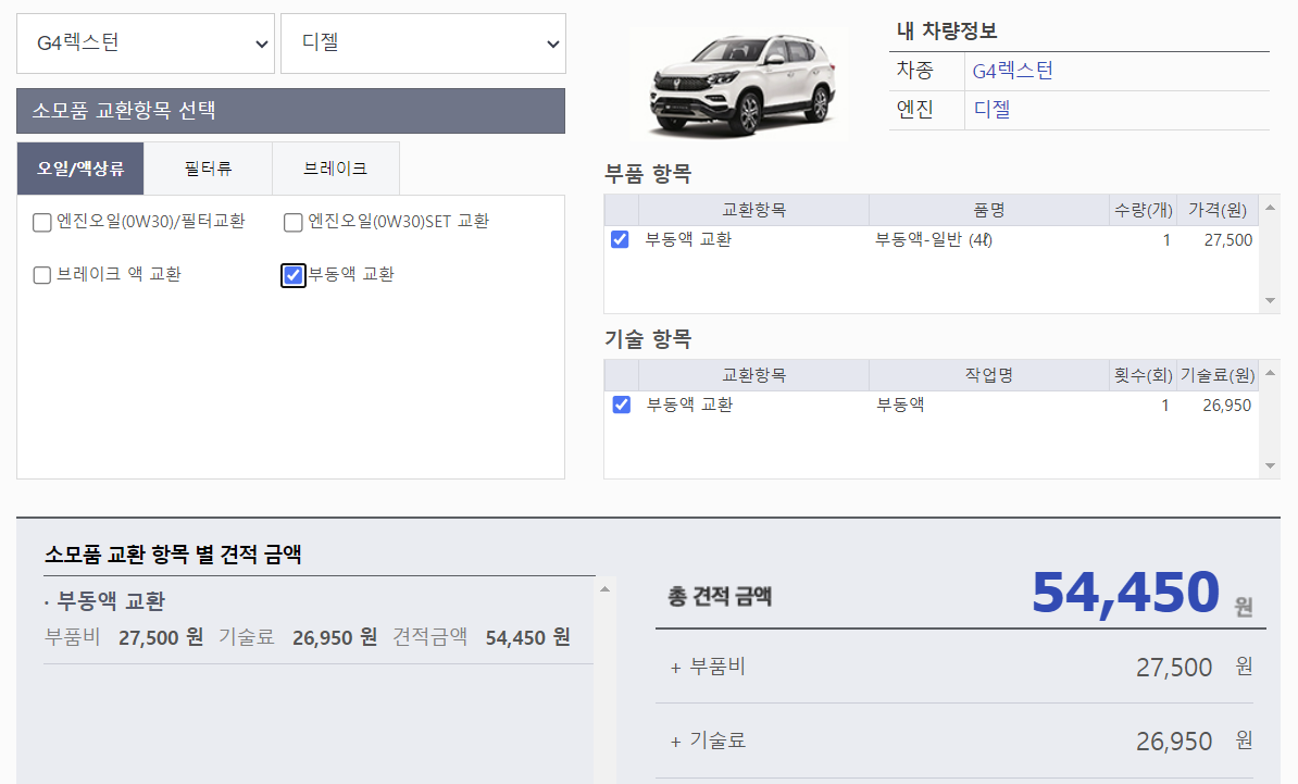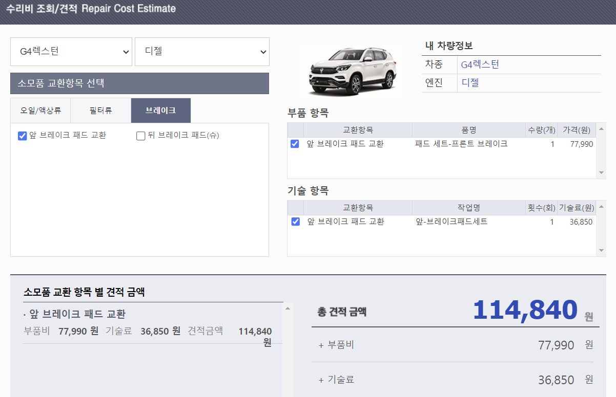 이외에도 G4렉스턴 연료 필터 교환, 브레이크 패드 교환, 브레이크액 교환, 부동액 교환의 금액도 표시했습니다. 뉴렉스턴, 렉스턴 스포츠 기종의 수리비 및 견적이 궁금하시다면 링크를 통해 자신과 같은 견적 프로그램을 사용 할 수 있습니다.