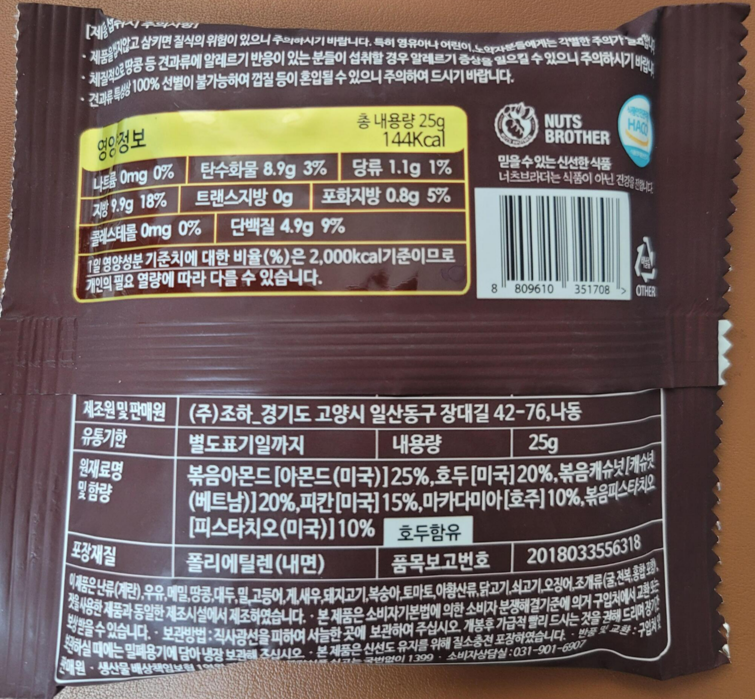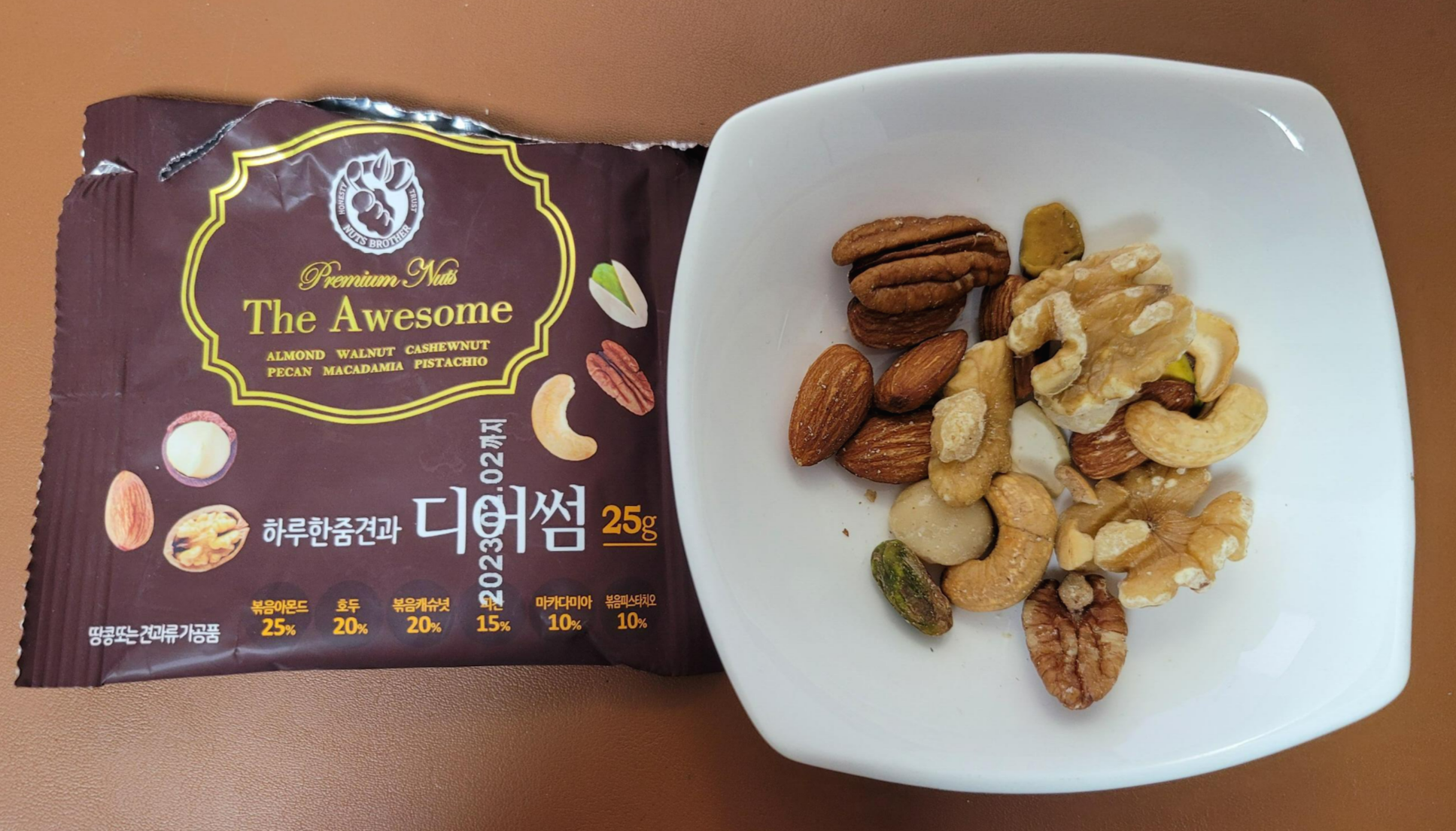 볶음 아몬드, 호두, 볶음 캐슈너트, 피칸, 마카다미아, 볶음 피스타치오가 들어있다. 이 가격에 이 정도 구성을 찾기 힘들다. 100% 견과류만 들어있어서 더 좋고 든든하다. 25g당 144칼로리 단백질 4.9g, 지방 9.9g