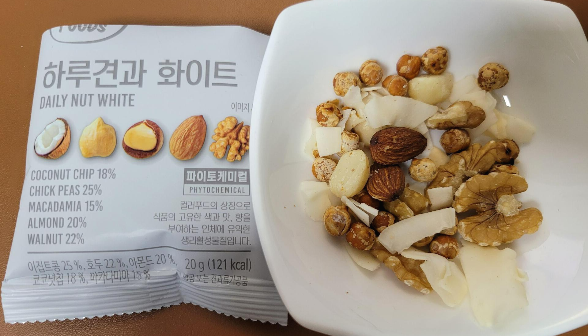 코코넛칩, 병아리콩, 마카다미아, 아몬드, 호두로 구성되었다. 하루견과 화이트의 중량과 칼로리는 20g(121kcal)이다. 구성은 지방 9g, 당류 2g, 단백질 3g 이다.