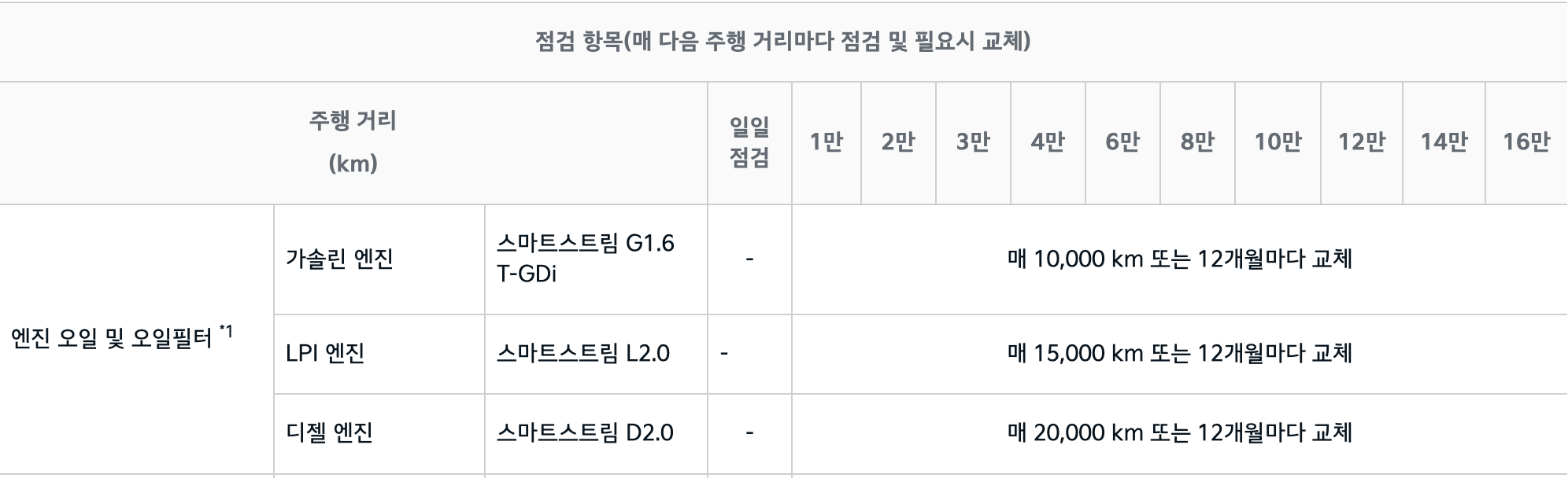 - 가솔린 엔진 스마트 스트림 G1.6 T-GDi 매 10,000km 또는 12개월마다 교체