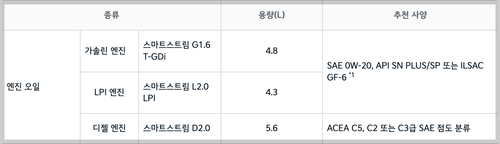 가솔린 기준 SAE 0W-20, API SN PLUS/SP or ILSAC GF-6입니다.