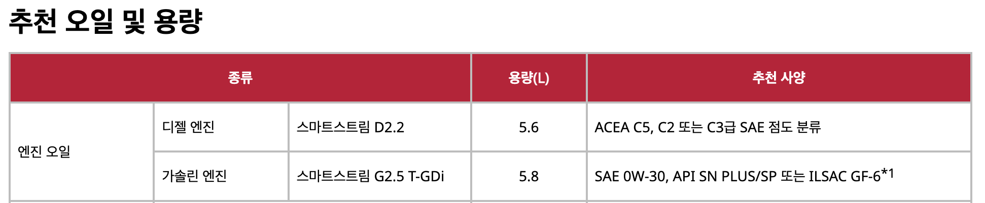 가솔린 휘발유는 SAE 0W-30, API SN PLUS/SP 또는 ILSAC GF-6을 추천합니다.