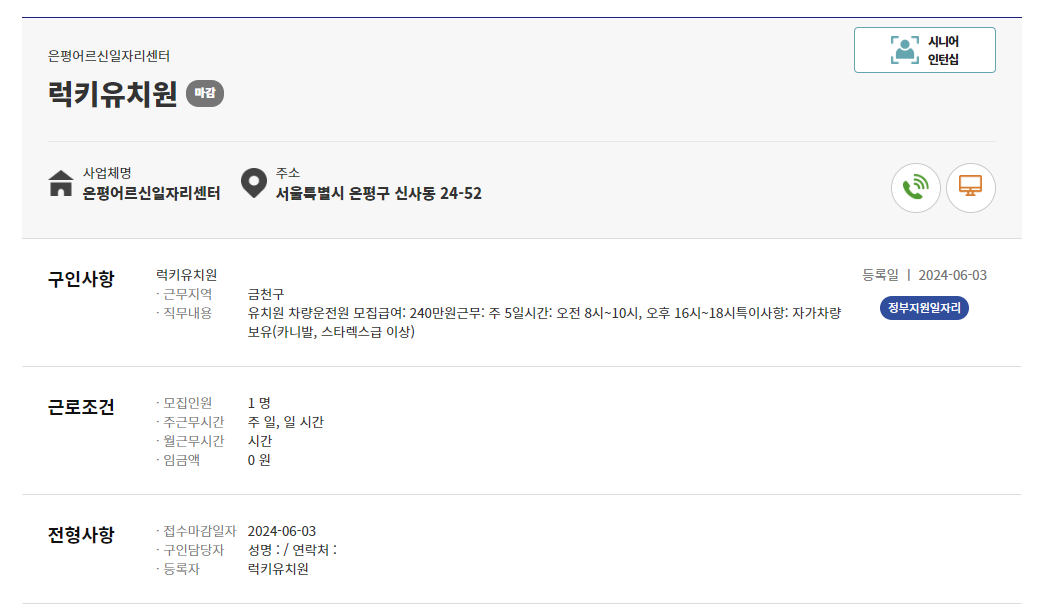 은평구어르신일자리센터 공고를 냈습니다. 하지만 근무지역은 금천구에 있는 럭키 유치원이네요. 이렇게 은평구를 검색했지만 실제로 근무하게 될 장소는 다를 수 있으니 꼭 확인해 보세요.