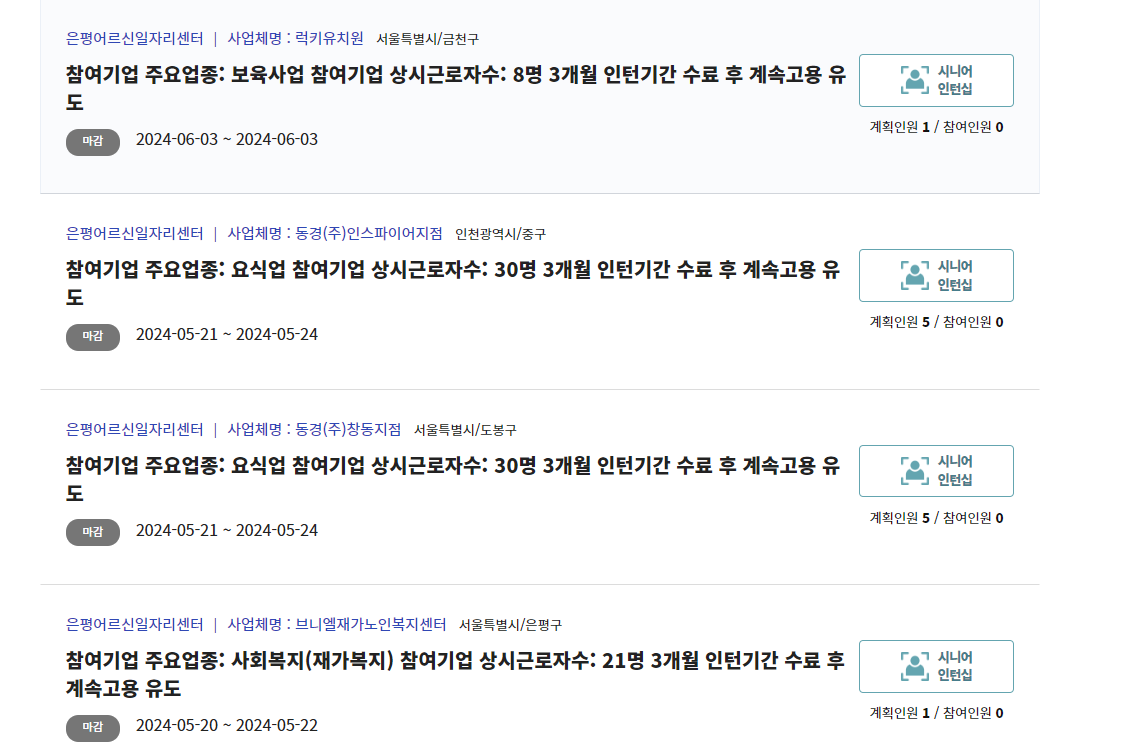 우측 시니어 인턴쉽 밑에는 계획인원과 참여인원이 나옵니다. 이를 통해 경쟁률을 확인할 수 있습니다.