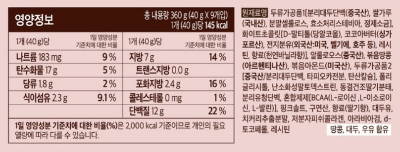 분리대두단백, 쌀가루, 분말셀룰로스, 효소처리스테비아, 화이트 초콜릿, 코코아버터, 전지분유, 레시틴, 향료, 알룰로오스, 땅콩, 아몬드, 폴리글리시톨, 난소화성말토덱스트린, 분리유청단백, 혼합제제(BCAA), 핑크솔트, 구연산, 황료, 대두유, 치커리추출분말, 저분자 피쉬콜라겐 등이 포함됩니다.