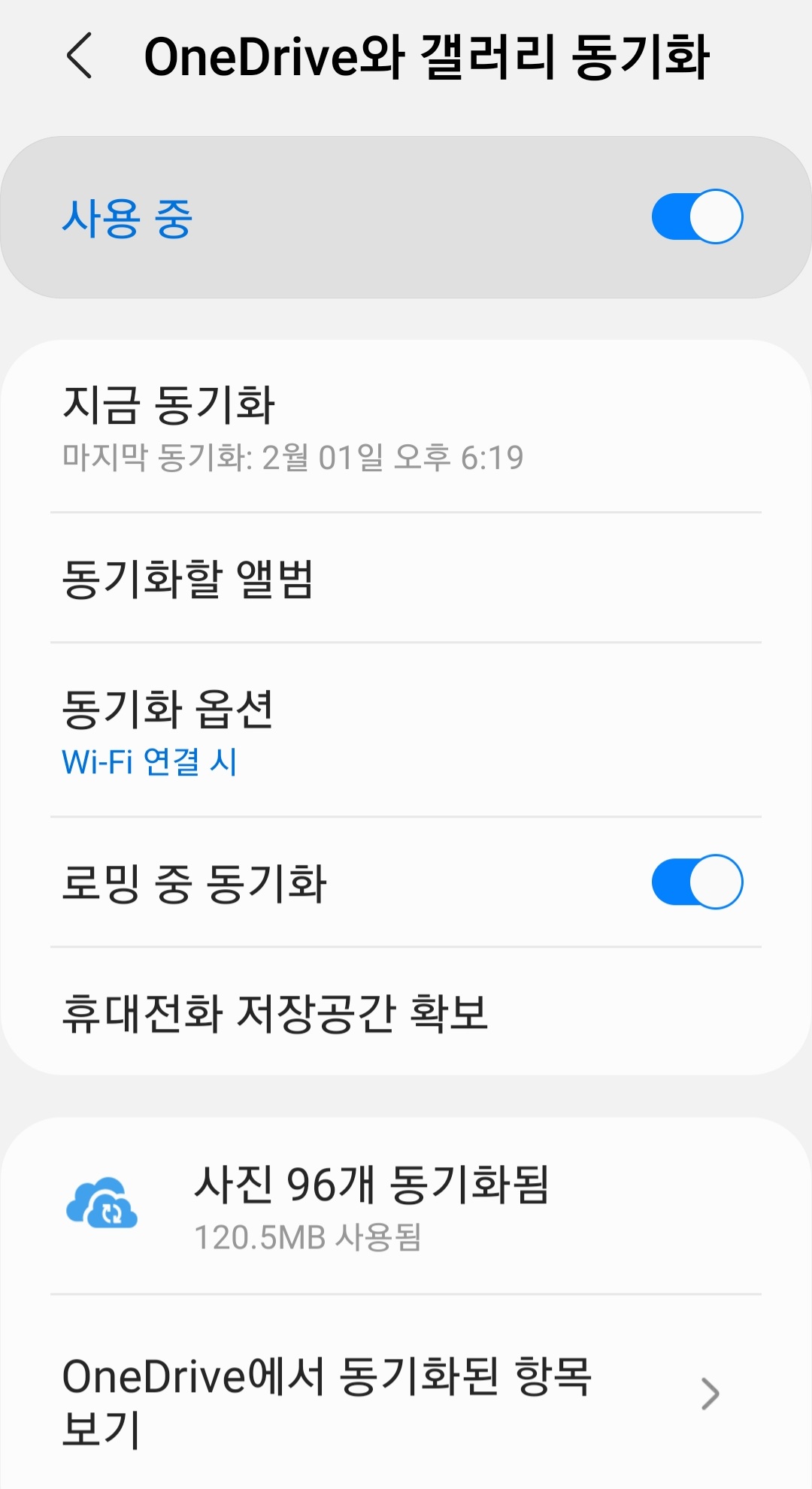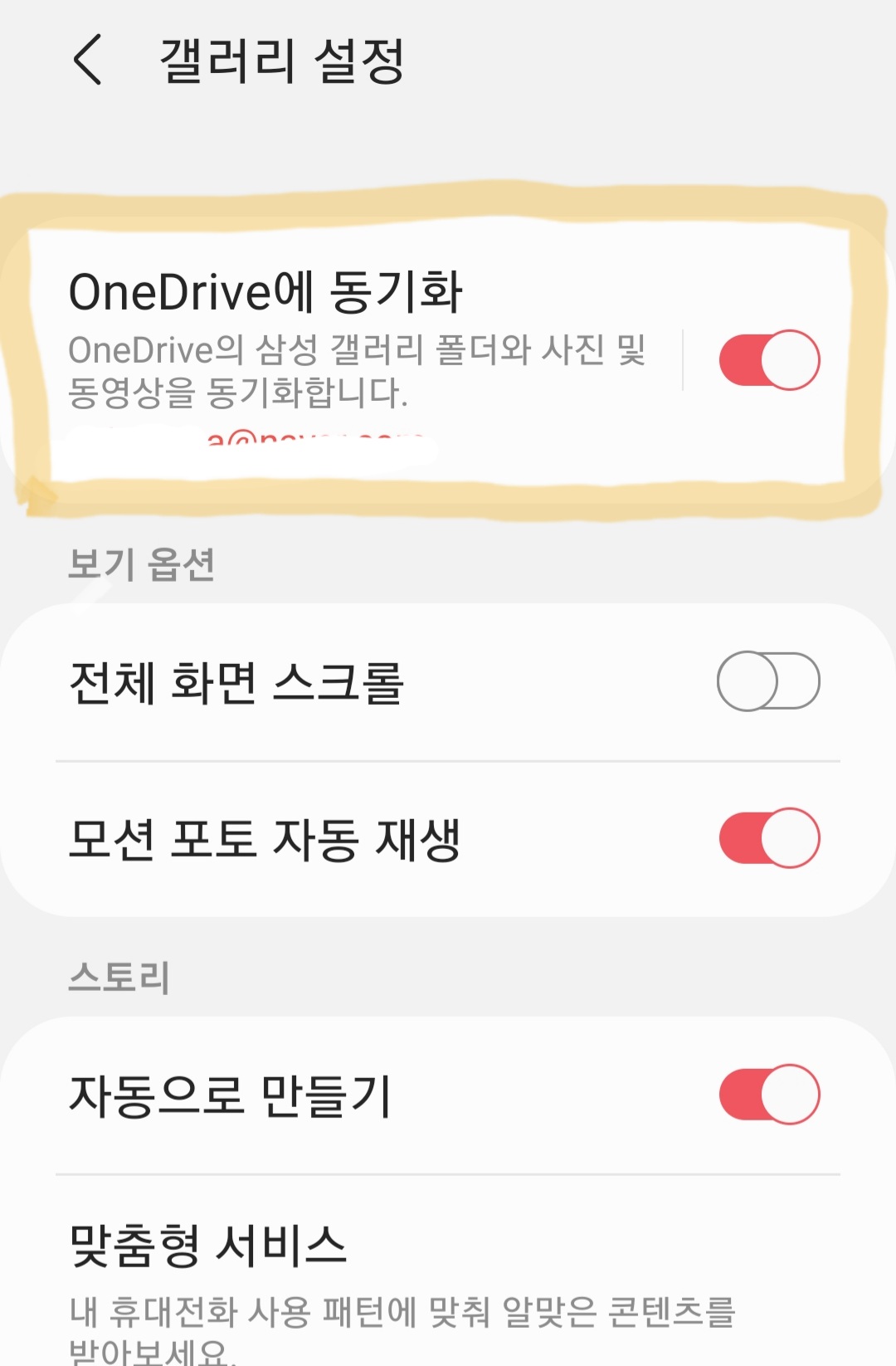 3. 노란 형광색으로 표시된 부분을 꾹 누르면 <OneDrive와 갤러리 동기화>로 들어가서 다양한 기능을 설정할 수 있다.