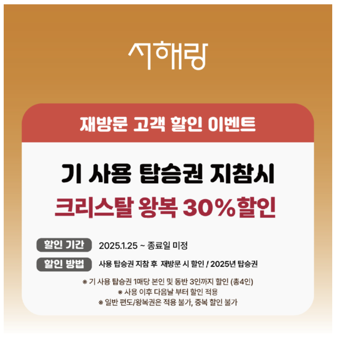 또한 2025년 탑승권을 가지고 계시다면 25년에 크리스탈 케이블카를 다시 탈 때 25% 할인을 받을 수 있습니다.