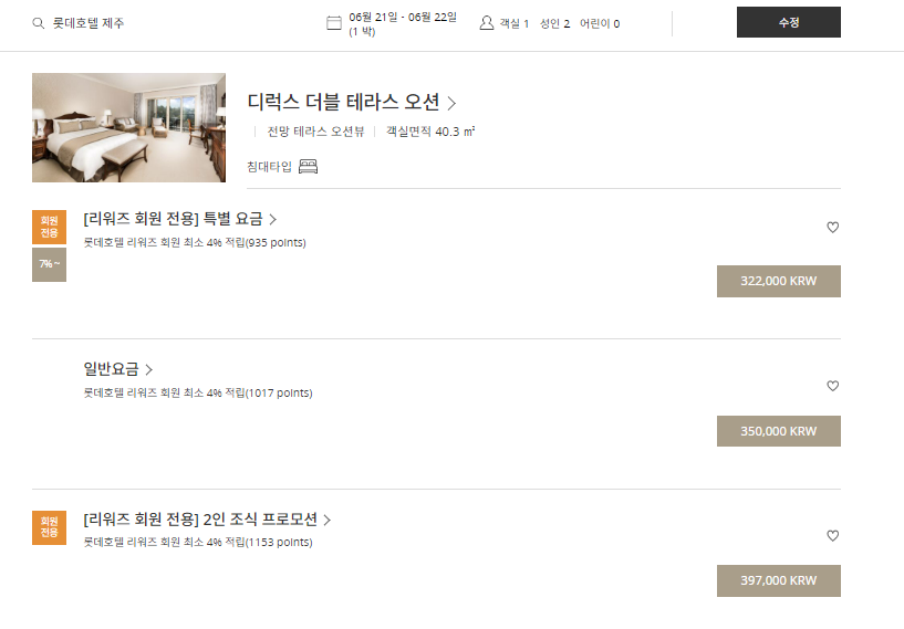 6월 21-22일 금,토 디럭스 더블테라스 오션뷰의 리워즈 회원 요금은 32만 원입니다. 회원 요금을 받는 방법은 밑에서 설명드리겠습니다.