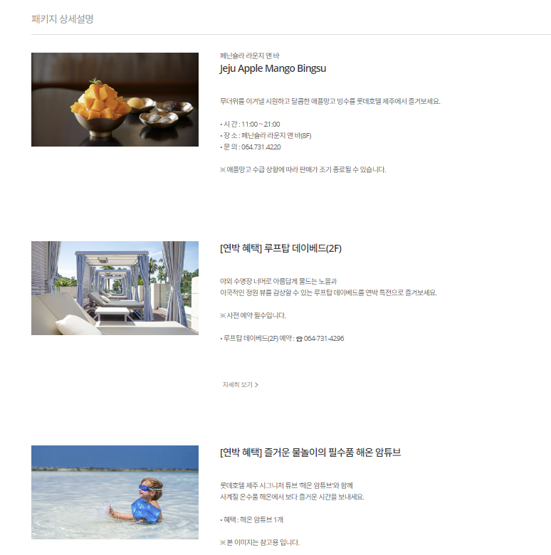 공식 홈페이지에서도 여러 프로모션을 진행하고 있습니다. 현재는 망고빙수, 객실업그레이드, 조식옵션이 있습니다.
