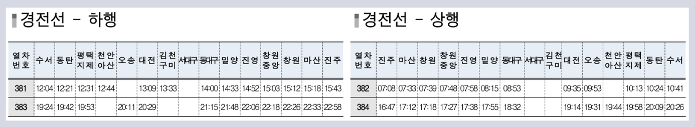 | 🚄 경부선 | 수서 → 동탄 → 평택지제 → 천안아산 → 오송 → 대전 → 김천구미 → 서대구 → 동대구 → 경주 → 울산 → 부산 |