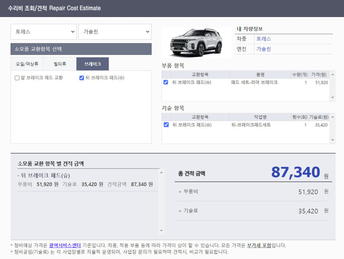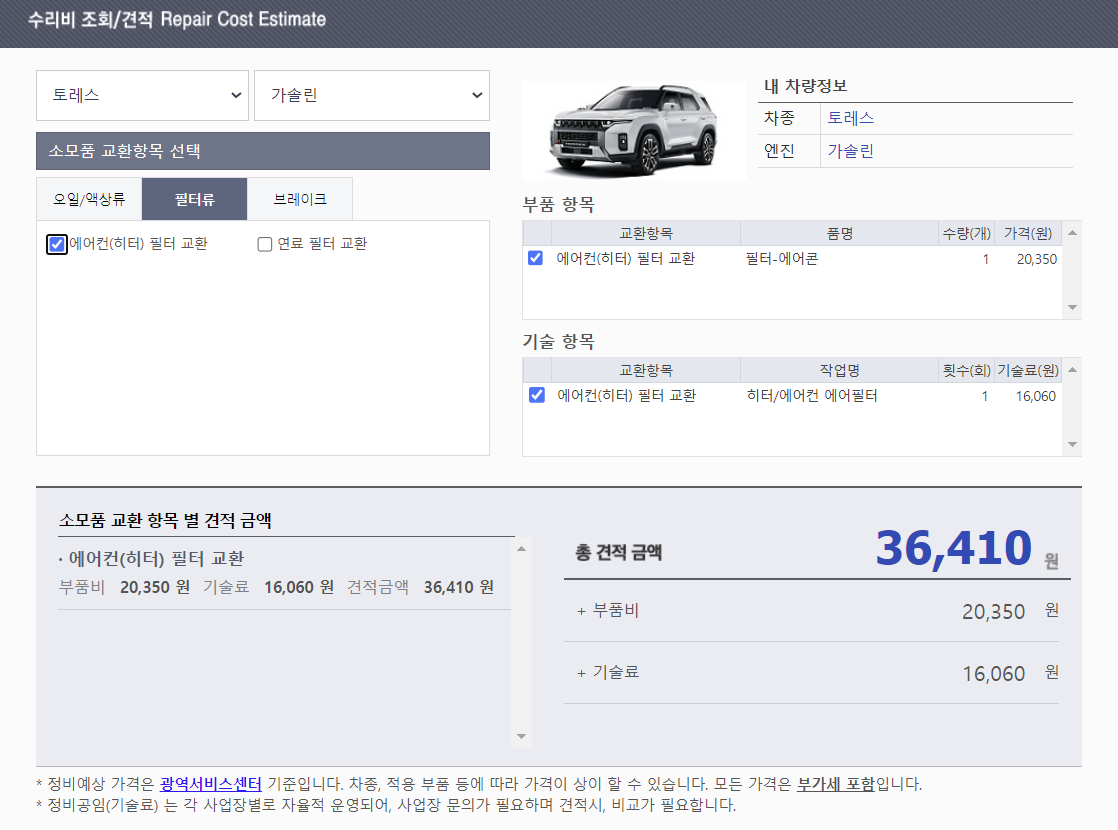 토레스 에어컨 필터 및 브레이크 패드 교환 비용