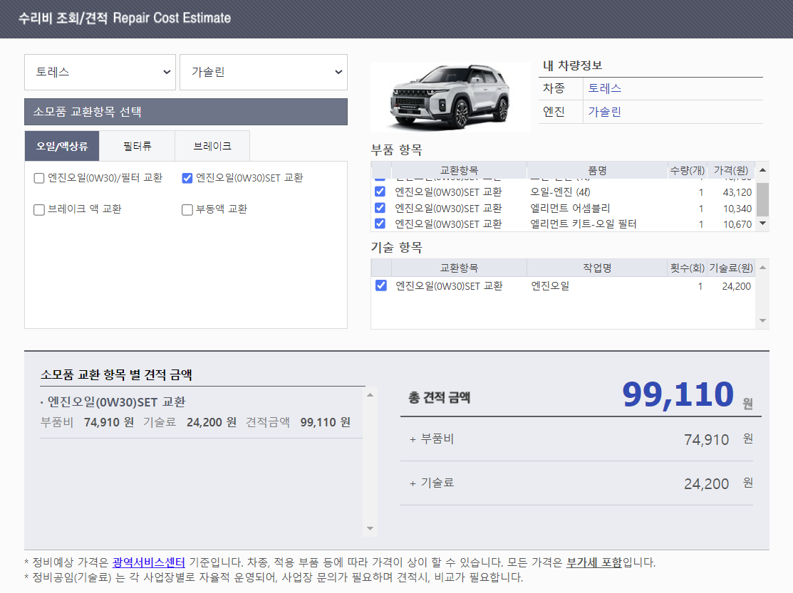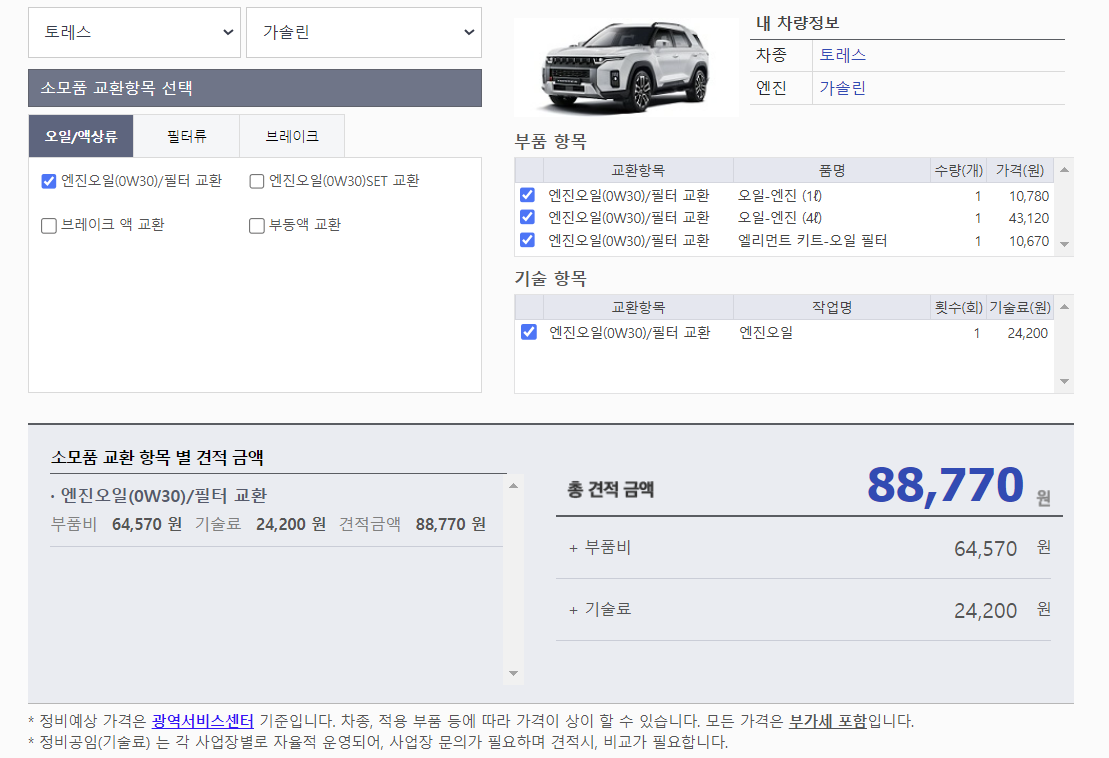 오늘은 토레스 서비스 센터에서 엔진오일 교체,에어컨 필터 교체 시 비용에 대해 설명드리겠습니다.