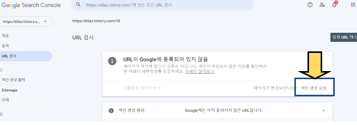 만약 URL이 등록되어 있지 않음이라고 나타나면 색인 생성 요청을 클릭한다.
