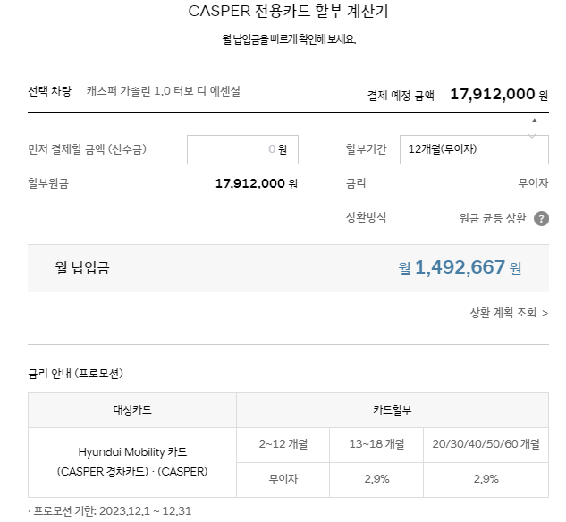 캐스퍼를 12월 31일 까지 구입하시게 되면 캐스퍼 전용카드로 12개월 무이자 구입이 가능합니다.