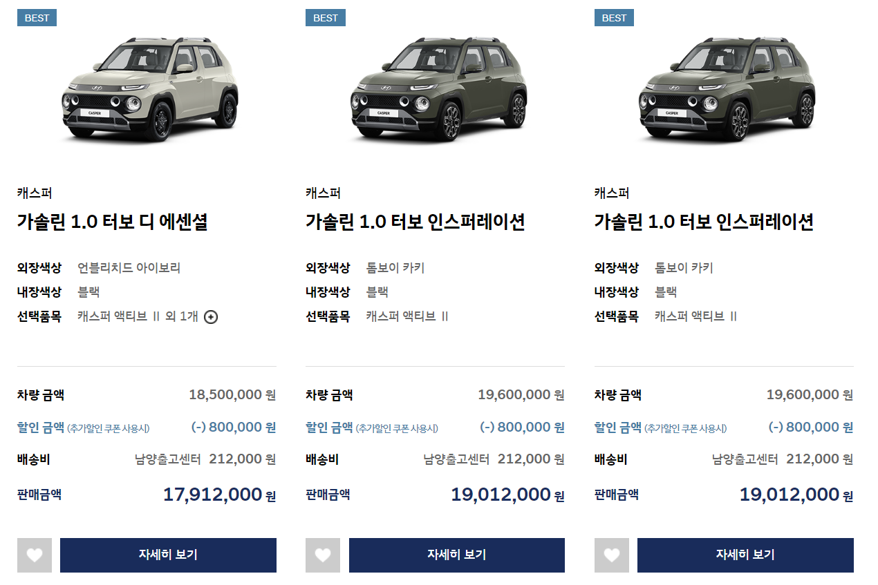 할인은 약 80만원 적용되며, 할인 적용 시 1800만 원에서 -1900만 원에 캐스퍼를 구매하실 수 있습니다.