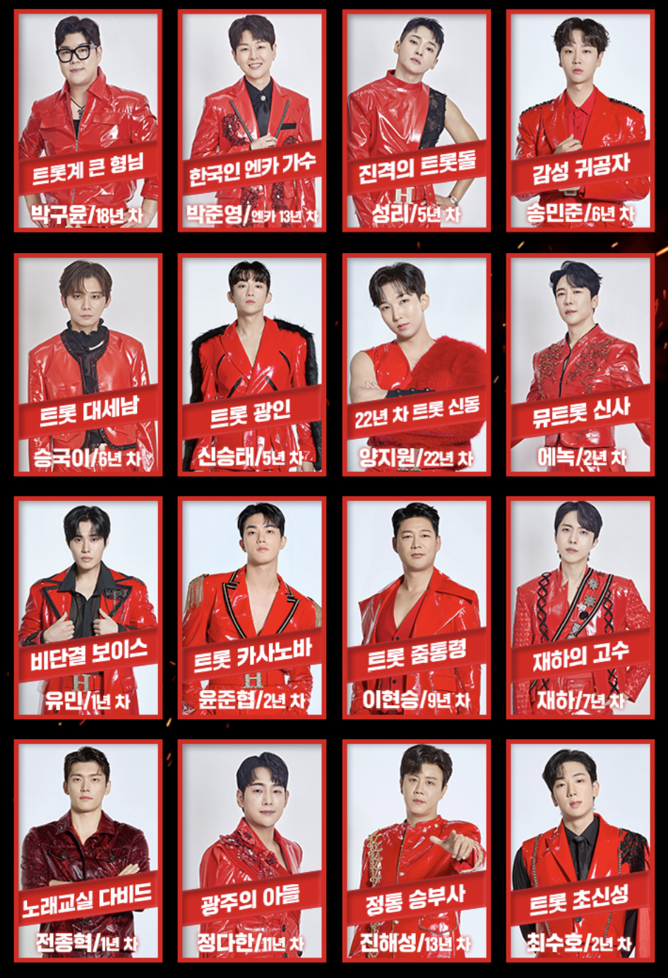 이번 시즌에는 34명의 남성 현역 가수들이 각기 다른 매력과 실력을 뽐내며 경쟁합니다. 주요 참가자들은 다음과 같습니다: