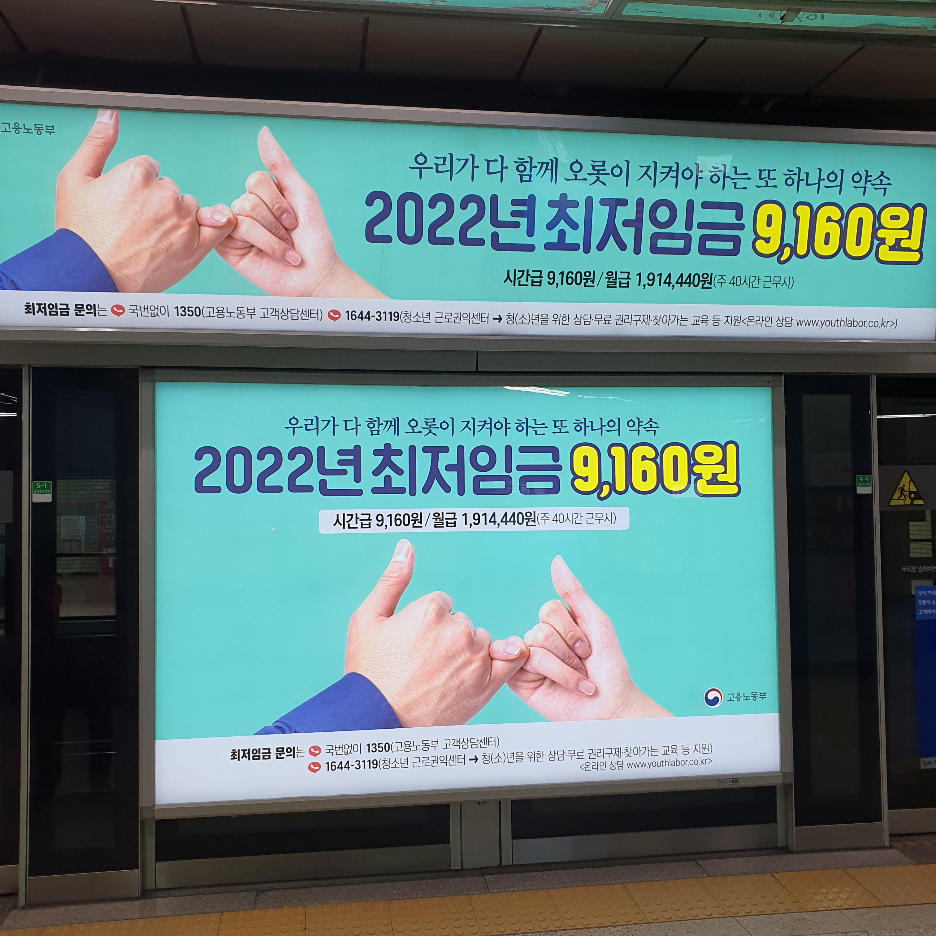 잠실역 지하철 내부에 최저임금 홍보가 있었다. 2022년 최저임금 9160원. 모든 사람들이 인지하고 혜택을 보라고 한 것일까? 업종상관없이 전 사업장에 동일한 최저임금이 적용되니 2022년 1월 월급부터 다르게 줘야한다는 사실 간과하지 않기.