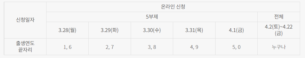 -온라인 신청은 3.28(월) 09시부터 4.22(금) 24시까지 PC 또는 모바일로 신청 홈페이지(worker.seoul.go.kr)에서 가능하고, 처음 5일간 5부제로 운영