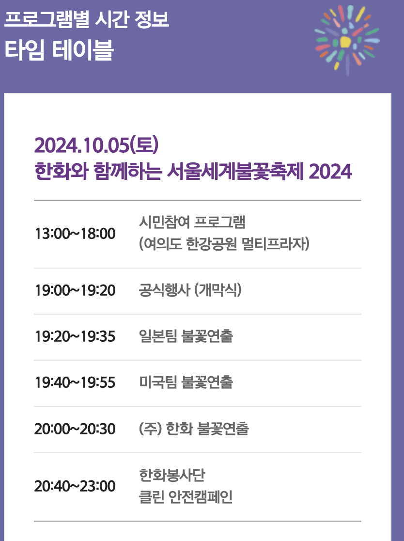 2024년 10월 5일(토)에 진행되는 '한화와 함께하는 서울세계불꽃축제 2024'의 프로그램별 시간표는 다음과 같습니다.