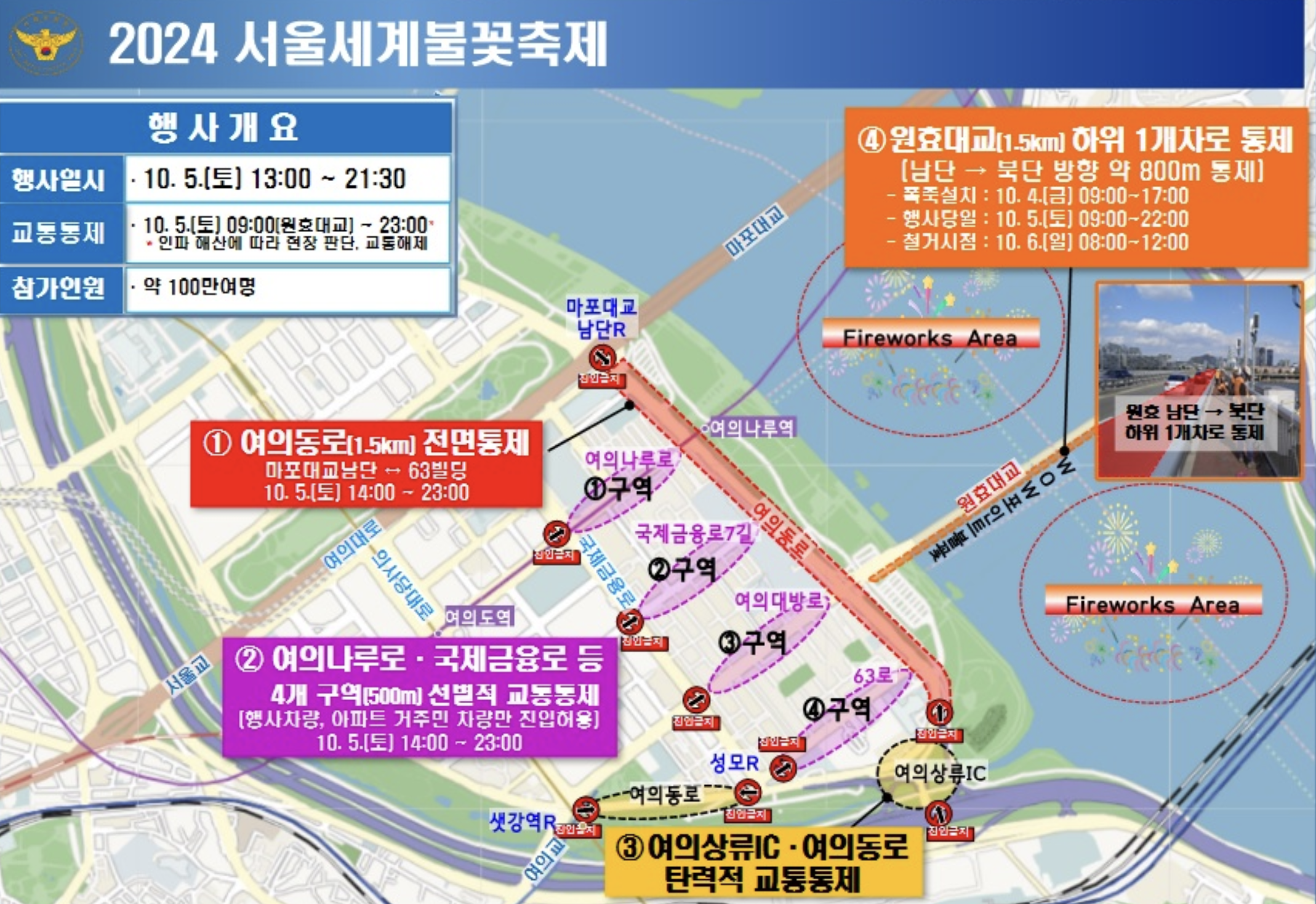 불꽃놀이 관람이 가장 집중되는 여의도 한강공원과 가까운 여의동로 마포대교 남단에서 63빌딩 구간은 축제 당일 밤 11시까지 전면 통제될 예정입니다. 이 구간을 지나려는 차량은 반드시 우회해야 하며, 대중교통을 이용하는 것이 좋습니다.