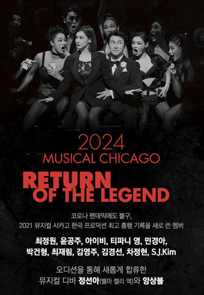 브로드웨이 역사상 가장 롱런하고 있는 미국 뮤지컬 시카고가 2024년 6월 다시 시작합니다. 뮤지컬 시카고는 전 세계적으로 33,500회 이상 공연하였으며 3,400만 명 이상이 관람한 뮤지컬입니다.