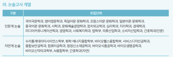 - 논술고사 인문계논술에는 국어국문학과~간호학과(인문)이 포함되며 아래사진에서 상세확인 가능합니다.