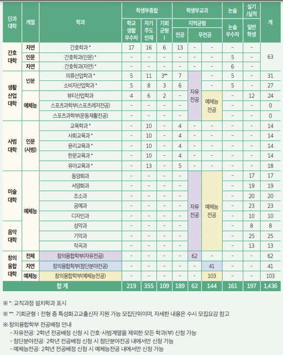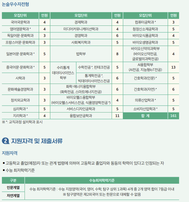 - 인문계열: 수능 지정영역(국어, 영어, 수학, 탐구 상위 1과목) 4개 중 2개 영역 9합 7등급 이내