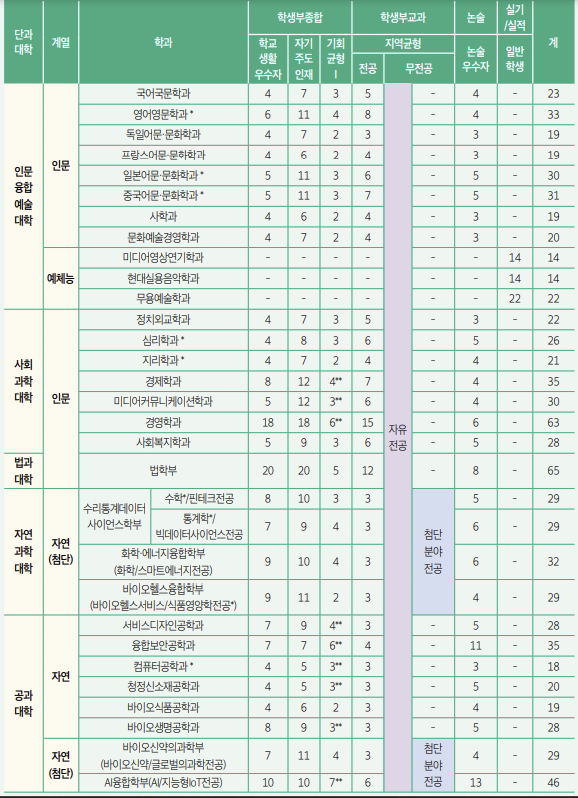 학과별 상세 모집단위로는 국어국문학과 4명, 영어영문학과 4명, 프랑스어문·문화학과 3명, 일본어문·문화학과 5명, 중국어문·문화학과 5명, 사학과 3명, 문화예술경영학과 3명, 정치외교학과 4명, 심리학과 4명, 지리학과 4명, 경제학과 4명, 미디어커뮤니케이션학과 6명, 경영학과 5명, 사회복지학과 5명, 법학부 8명, 수리통계데이터사이언스학부 4명, 수학전공, 핀테크전공 6명, 통계학전공, 네이버클라우드전공 4명, 화학·에너지융합학부 6명 (화학전공, 스마트에너지전공), 바이오헬스융합학부 8명 (바이오의료서비스전공, 생명공학전공), 서비스디자인공학과 5명, 융합보안공학과 11명, 컴퓨터공학과 3명, 정보시스템공학과 3명, 바이오식품공학과 5명, 바이오생명공학과 4명, 바이오신약의과학부 6명 (바이오의약전공, 글로벌의생명과학전공), AI융합학부 13명 (AI/지능형소프트웨어전공), 간호학과(인문계) 5명, 간호학과(자연계) 6명, 의류산업학과 5명, 소비자생활학과 5명입니다.