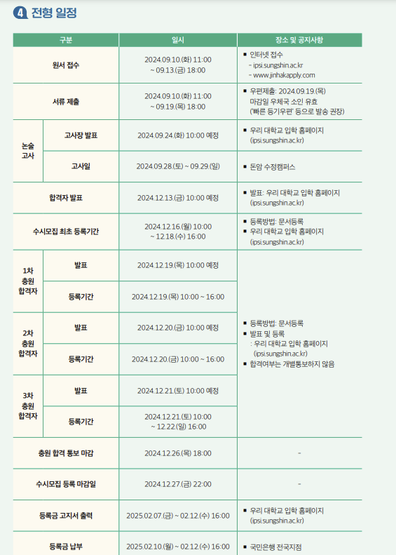 - 고사장 발표: 2024년 9월 24일(화) 오전 10시에 고사장 발표 예정. 성신여자대학교 입학 홈페이지에서 확인가능합니다.