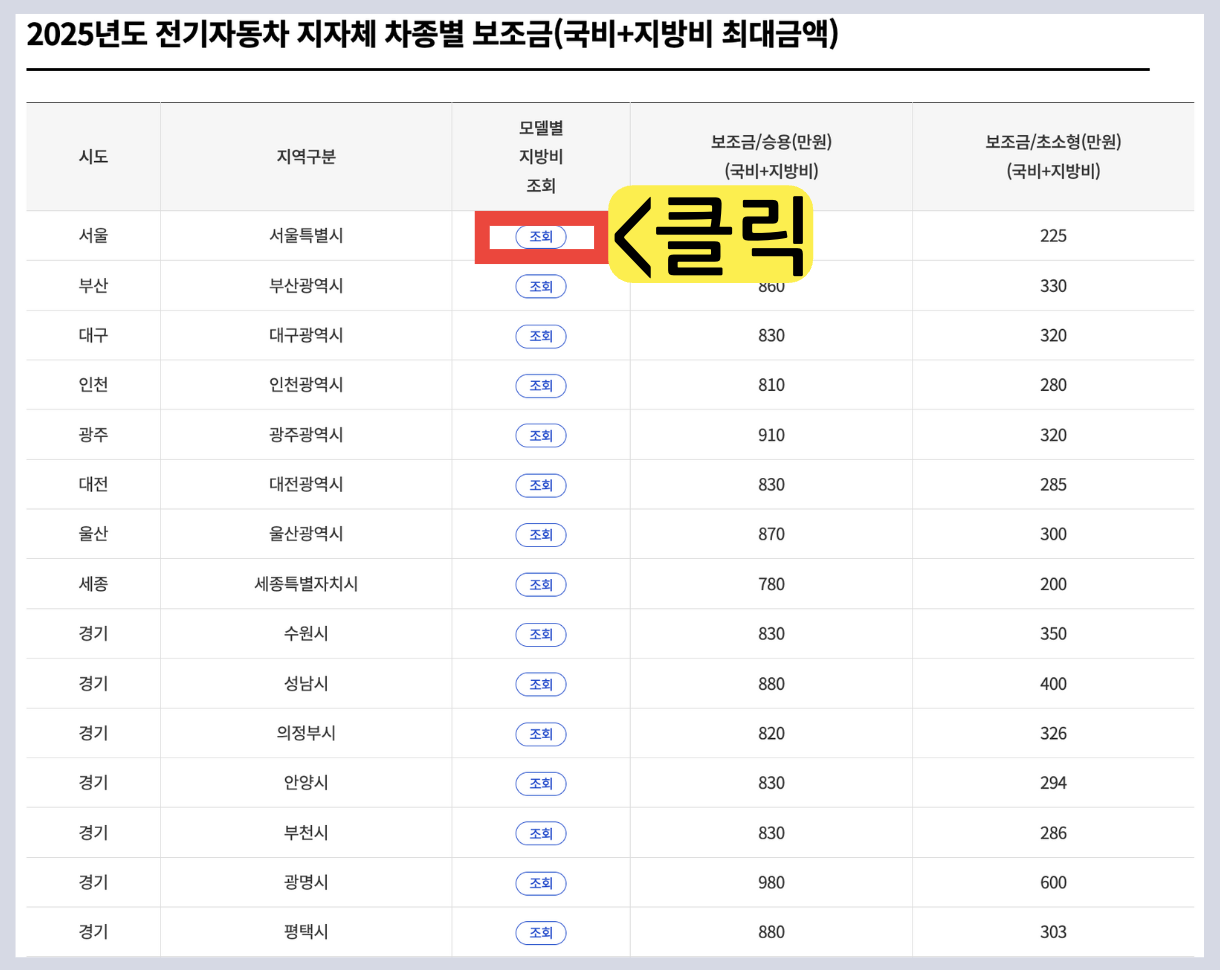 3️⃣ 지역구분에서 거주지역 확인 후 모델별 지방비 조회클릭