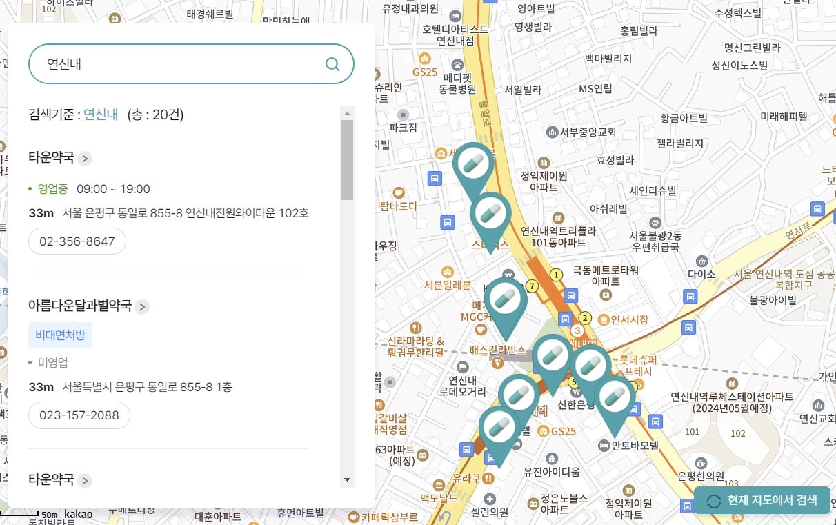 예시로 연신내라고 검색했습니다. 일요일 영업 중인 약국이 실시간으로 검색됩니다. 운영을 안 하는 곳은 미영업이라고 나타납니다. 아래 왼쪽에 있는 [현재 지도 검색]을 통해 더욱 편리하게 내 근처 운영 약국 확인이 가능합니다.