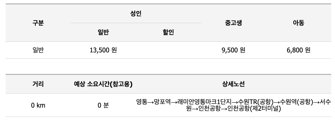 영통→망포역→래미안영통마크 1단지→수원 TR(공항)→수원역(공항)→서수원→인천공항→인천공항(제2터미널)
