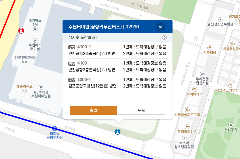 - 수원터미널 정류장: 이마트수원점 앞(정류장번호 02936)