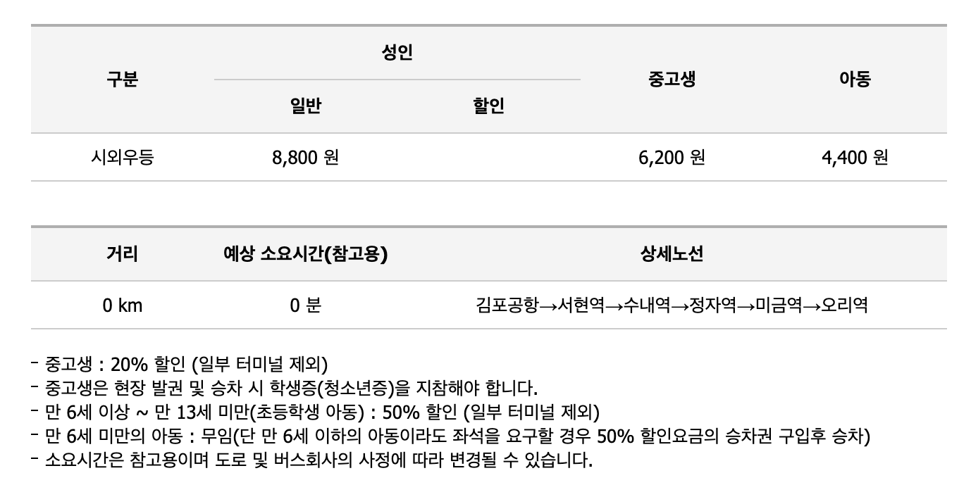 | 농수산물센터(출발) | 청솔마을(미금역) | 정자역 | 롯백, 수내역 | 서현역 | 김포공항국제선(출발) |
