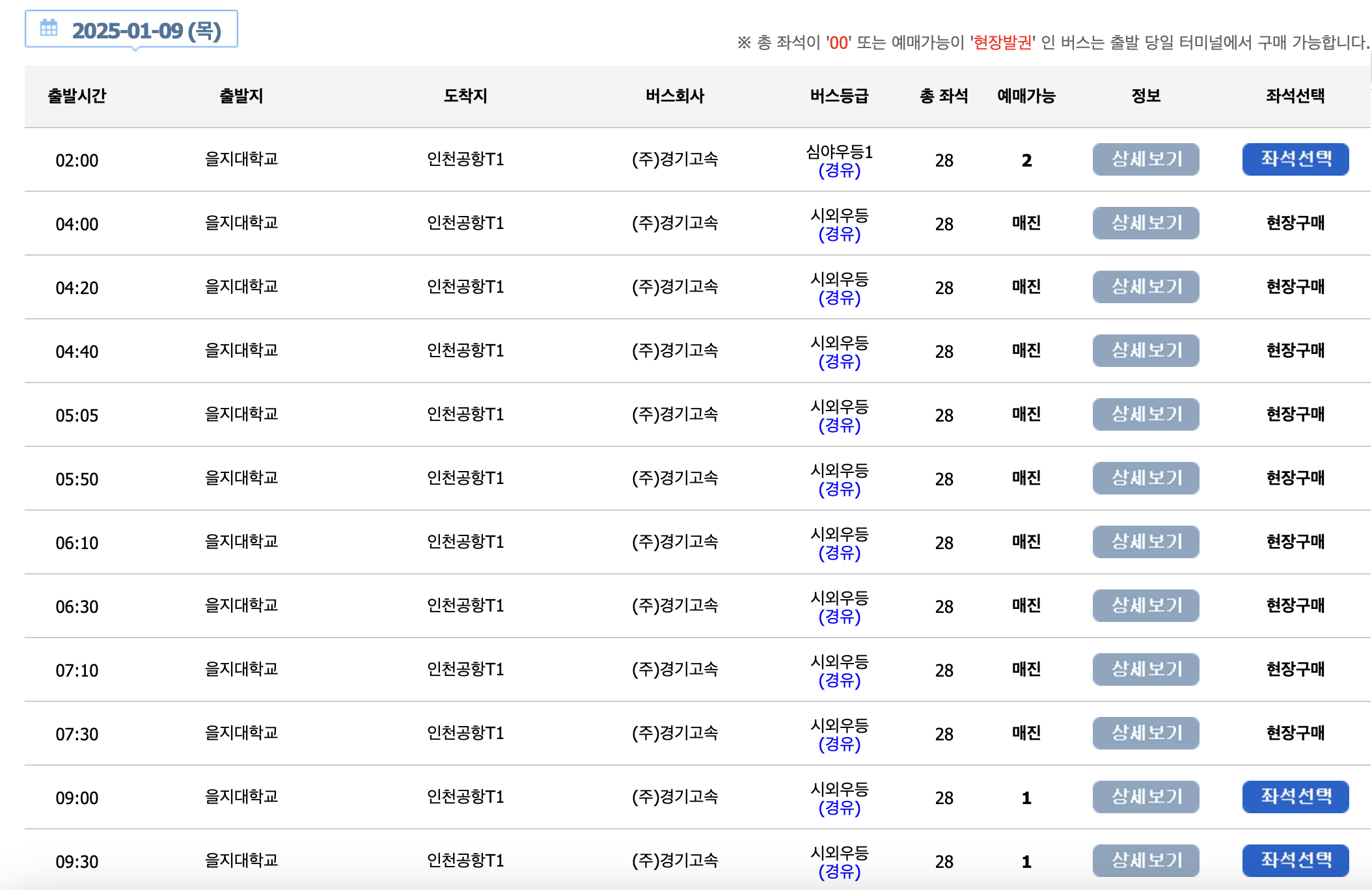 3️⃣ 출발지와 도착지 탑승날짜를 선택 후 조회하면 탑승시간을 확인할 수 있습니다.