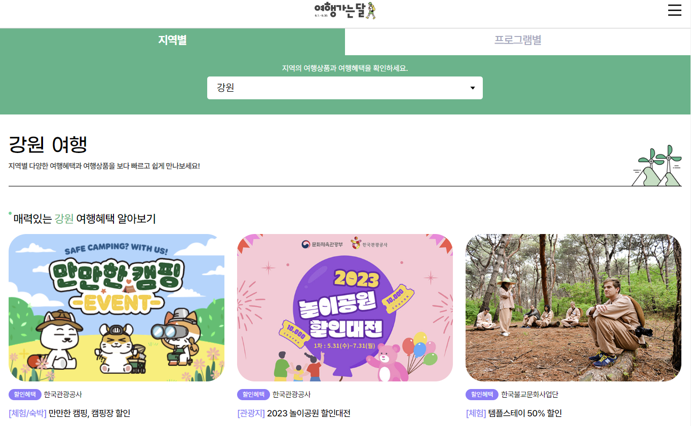 문화체육부와 한국관광공사가 6월 한 달간 '2023년 여행 가는 달'을 추진합니다. 올해 '여행 가는 달'의 주제는 '대한민국은 절찬 여행 중' 입니다. 이 기간 동안 교통 최대 50%, 숙박 3-5만 원 할인, 테마파크 1만 원 할인 등 다양한 할인혜택이 제공됩니다. '여행 가는 달' 공식 홈페이지에서는 '여행 트렌드관'을 통해 각 여행객의 취향에 맞는 여행을 즐길 수 있도록 특별한 여행프로그램을 만들었으니 참고 바랍니다.