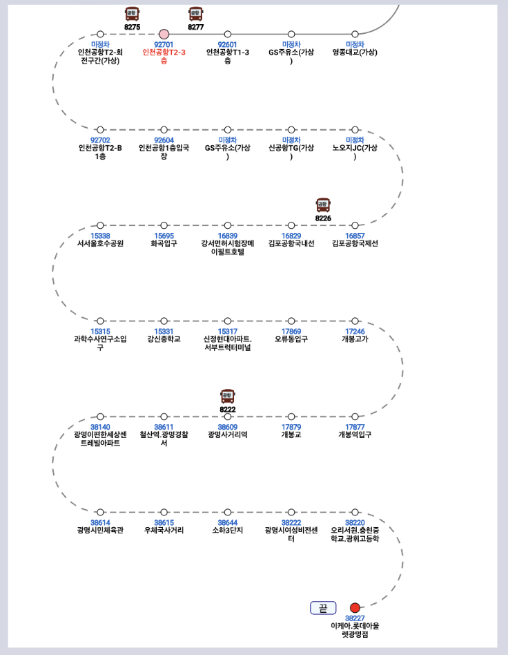 🚏 광명KTX역 > 광명라까사호텔 > 충현중이원익기념관 > 소하 3단지 > 광명우체국사거리 > 광명시민체육관 > 복지관운동장 > 철산역 > 광명사거리역 > 개봉교 > 개봉현대 A개봉역입구 > 경인중학교개봉사거리 > 호텔베르누이(오류동입구) > 서부화물트럭터미널 > 강신중학교 > 과학수사연구소 > 서서울호수공원 > 화곡입구 > 강서면허시험장 (메이필드호텔) > 김포공항국내선 > 김포공항국제선 > 인천공항 1 터미널 > 인천공항 2 터미널