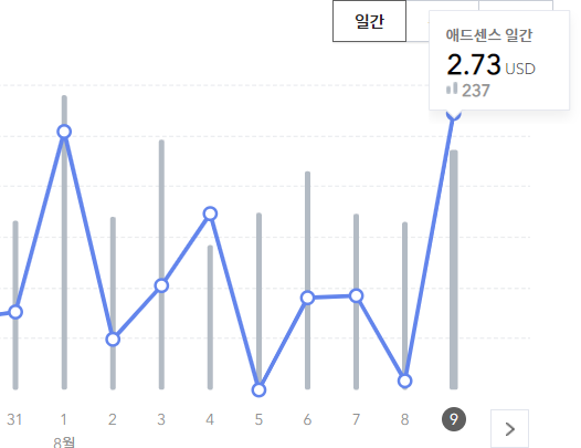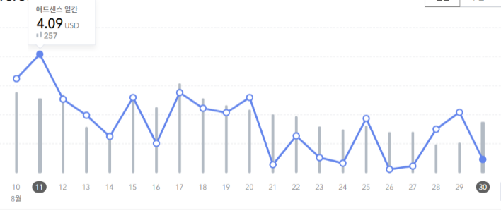 8월 5일과 8일에는 수익이 0원 이었다. 이때 티스토리에 들어왔으면 정말 우울했을 텐데 다행히 직장에서 바쁜 날들을 보내고 있어서 몰랐다. 하루 평균값으로 계산했을 때는 8월 하루 평균 1.5달러의 돈을 번 셈이다.