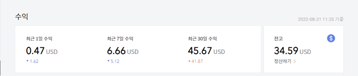 8월 한 달간 총 4개의 글을 썼다. 4개 중에서도 두 개는 어제 쓴 거라 실질적으로 8월에 수익이 날 수 있었던 글은 2개였다. 하지만 8월 달의 수익은 티스토리를 시작한 2022년 1월부터 8월까지 8개월 중 가장 높은 수익이다. 8월의 예상수입은 45.67 USD 대략 45달러이다.