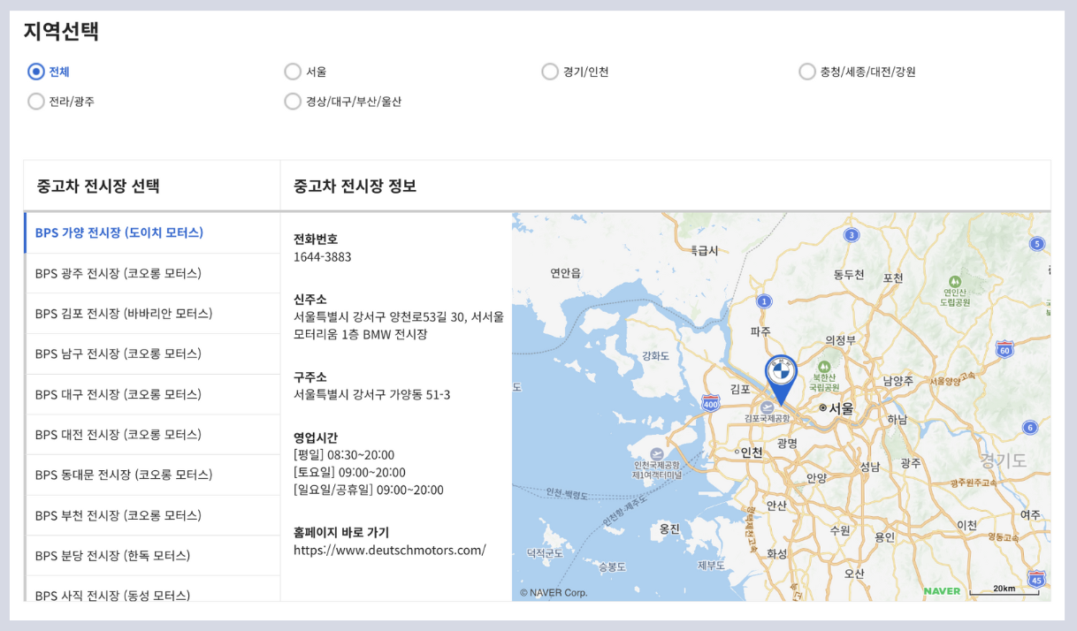 (중고차 구매 시 각 BPS 전시 매장에 직접 전화하시는 게 더욱 빠릅니다.)