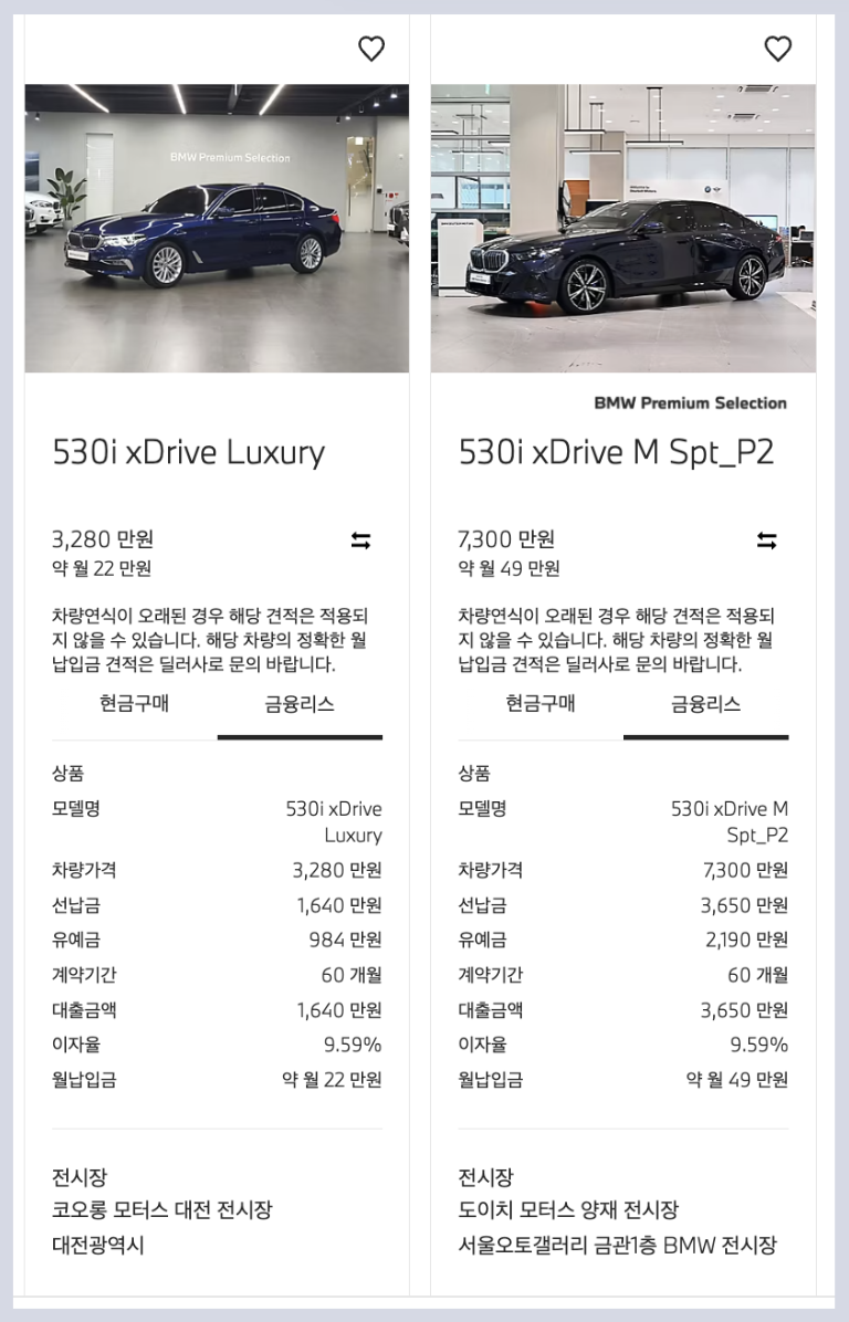 ✳️ 현금구매 또는 리스구매 상품이 구분되어있습니다. 5시리즈 검색 시 3000만 원 후반 -7천만 원 중반까지 키로수와 옵션에 따라 다양합니다.